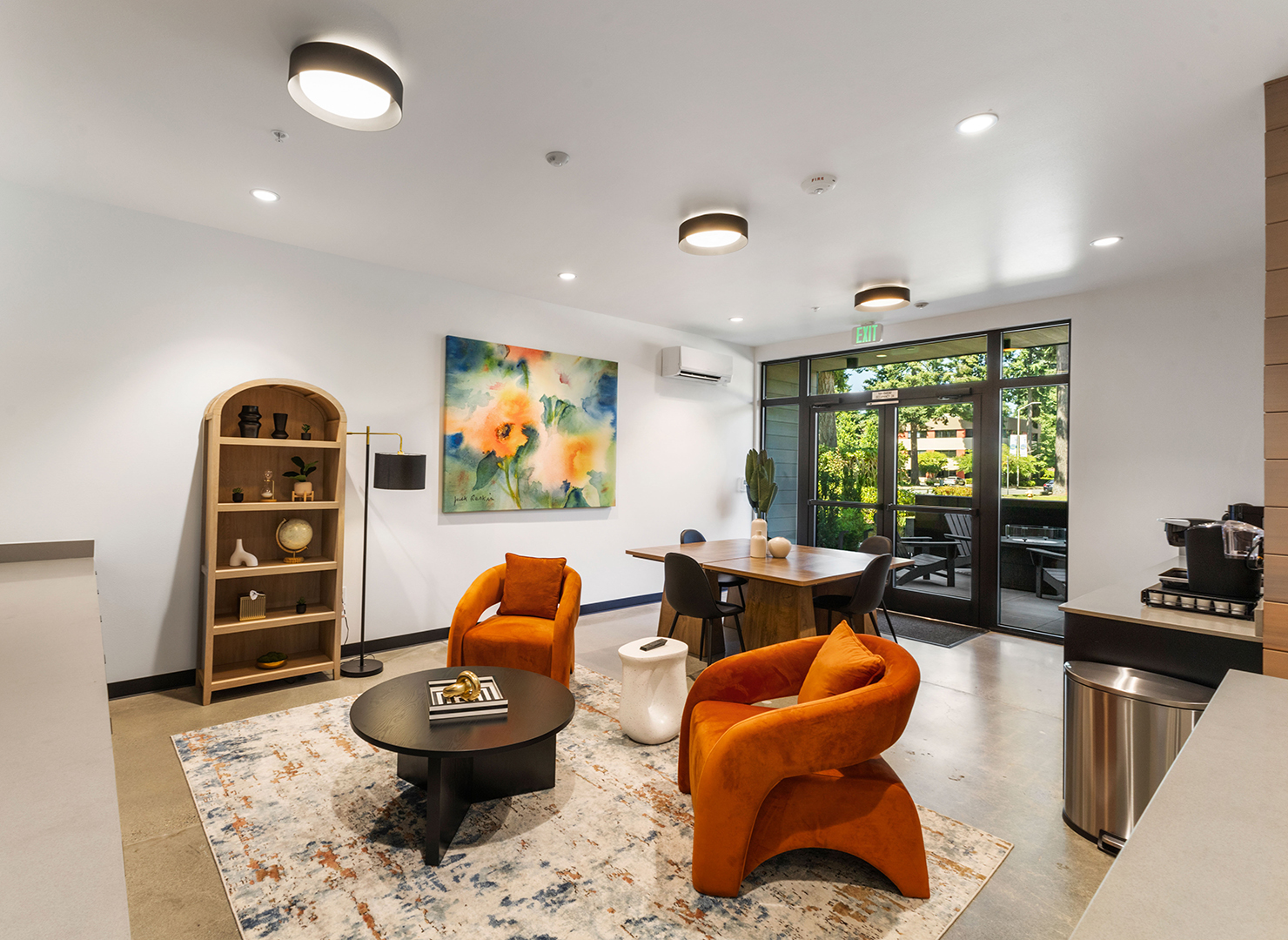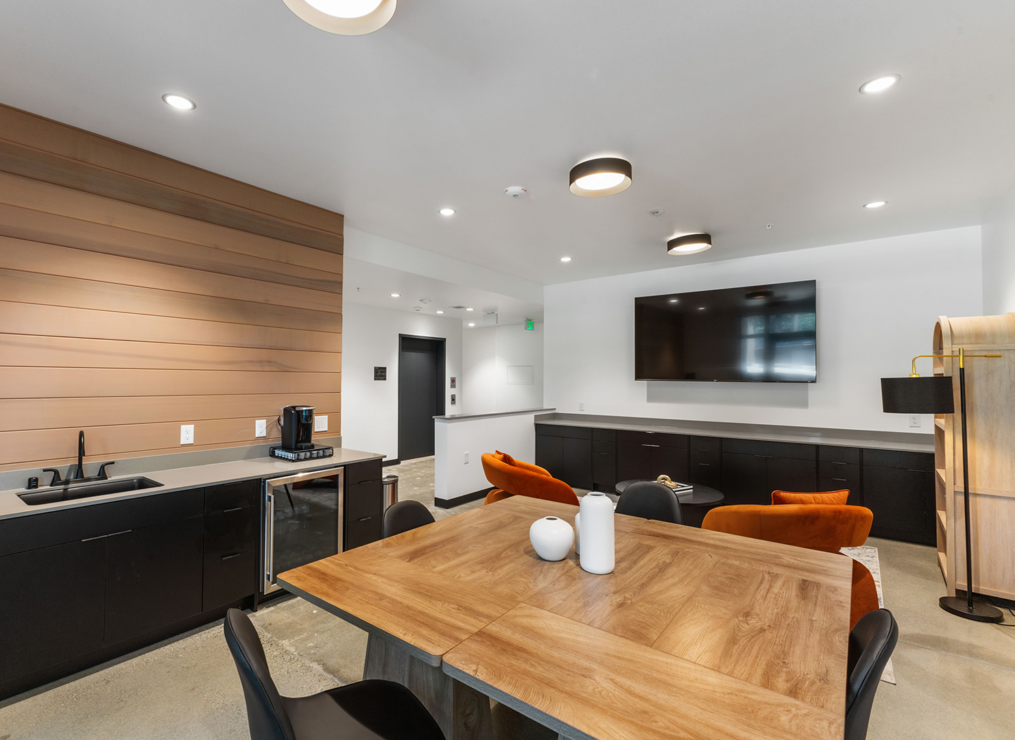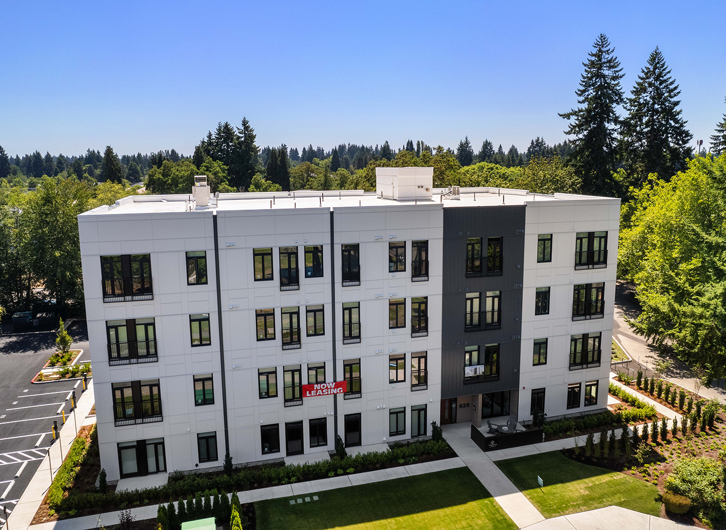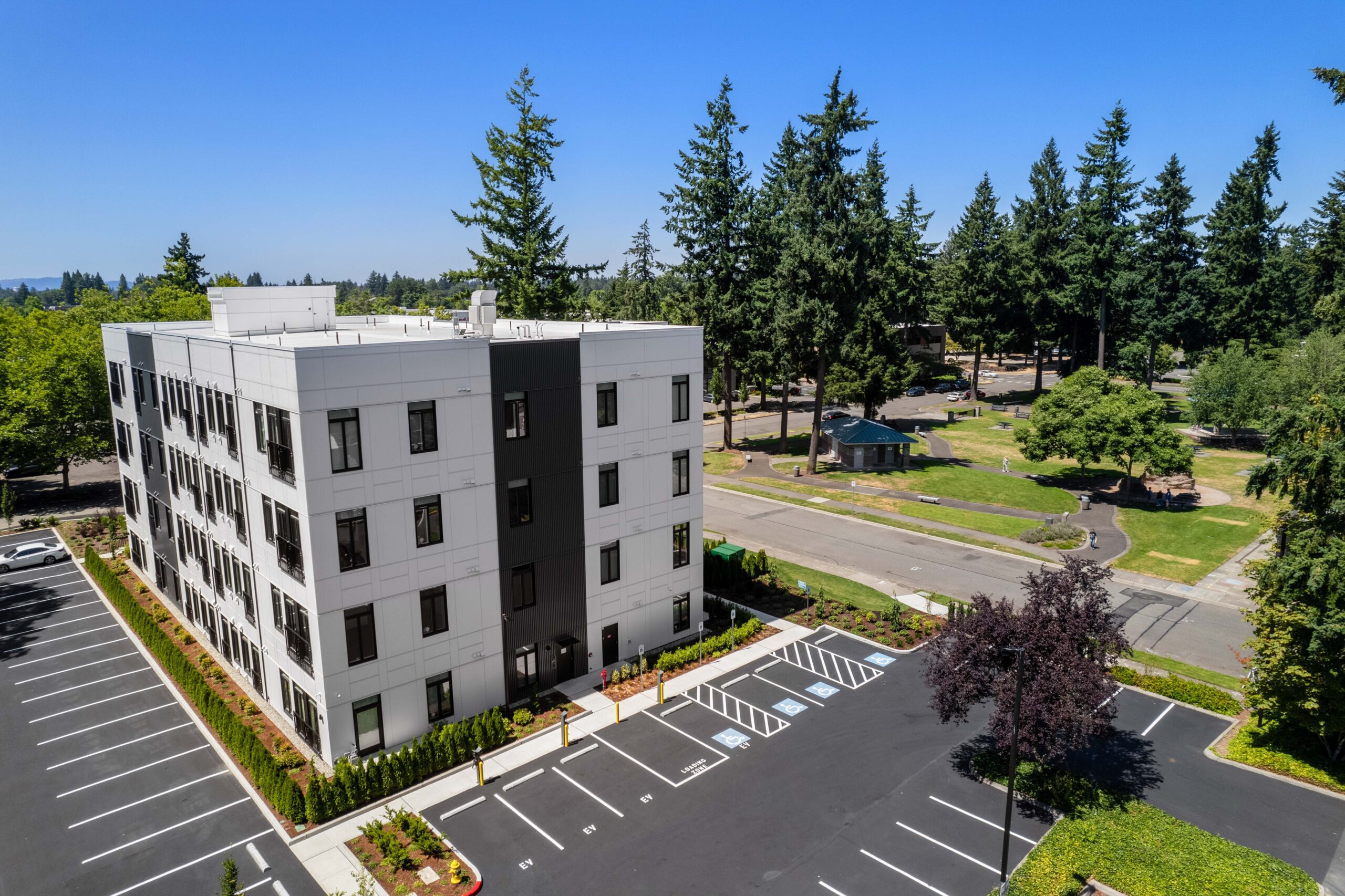 The Hub is the conversion an existing four-story office building (B occupancy) into a 50-unit apartment building (R2 occupancy), consisting of studios, one, and two-bedroom units totaling 34,000 square feet. The exterior of the building was updated with a new roof, windows, and siding. Interior renovations included new drywall, flooring, MEPF systems, and converting existing office floor plates into apartment units, utilizing the existing stairwells and elevator. The existing site improvements included new landscaping and resurfacing the existing parking lot, with the addition of EV charging stations.