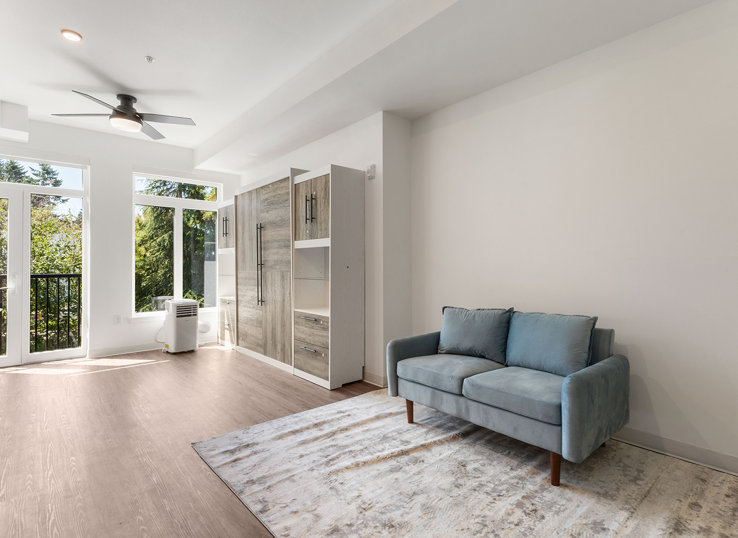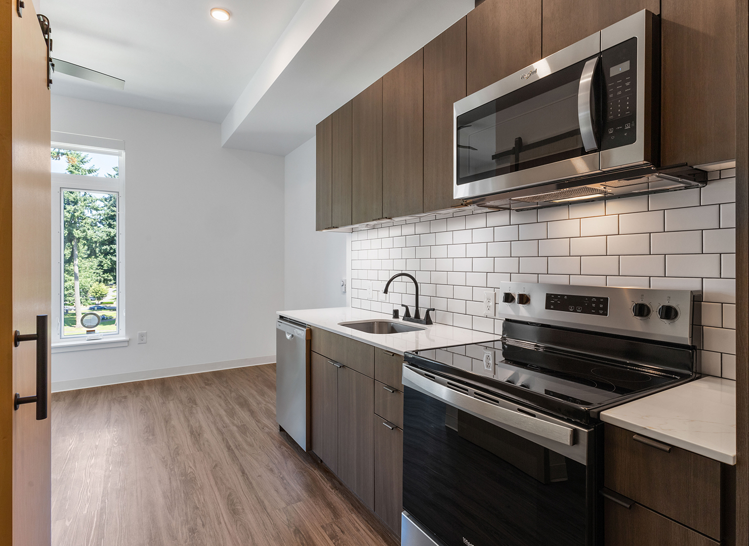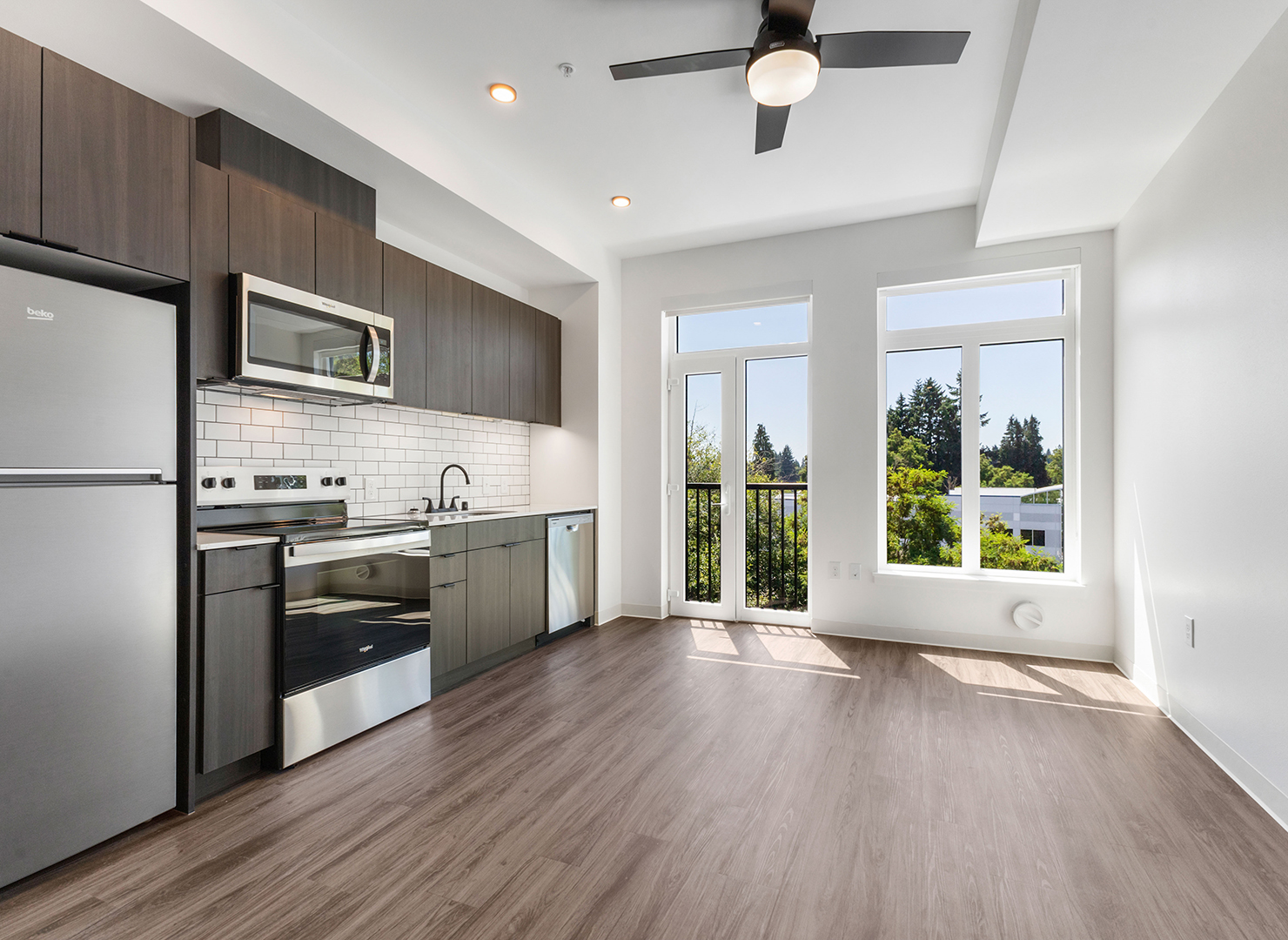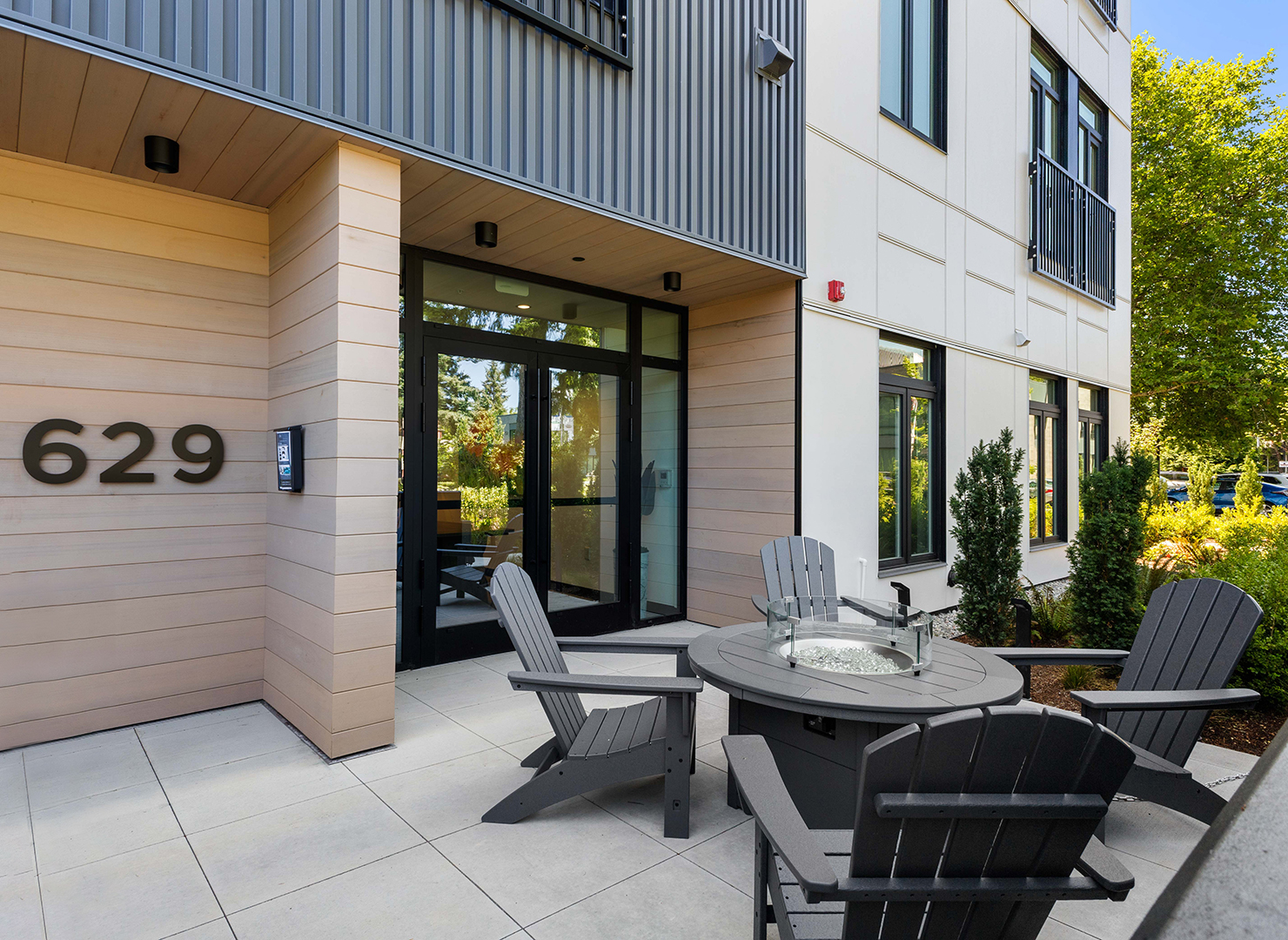 The Hub is the conversion an existing four-story office building (B occupancy) into a 50-unit apartment building (R2 occupancy), consisting of studios, one, and two-bedroom units totaling 34,000 square feet. The exterior of the building was updated with a new roof, windows, and siding. Interior renovations included new drywall, flooring, MEPF systems, and converting existing office floor plates into apartment units, utilizing the existing stairwells and elevator. The existing site improvements included new landscaping and resurfacing the existing parking lot, with the addition of EV charging stations.