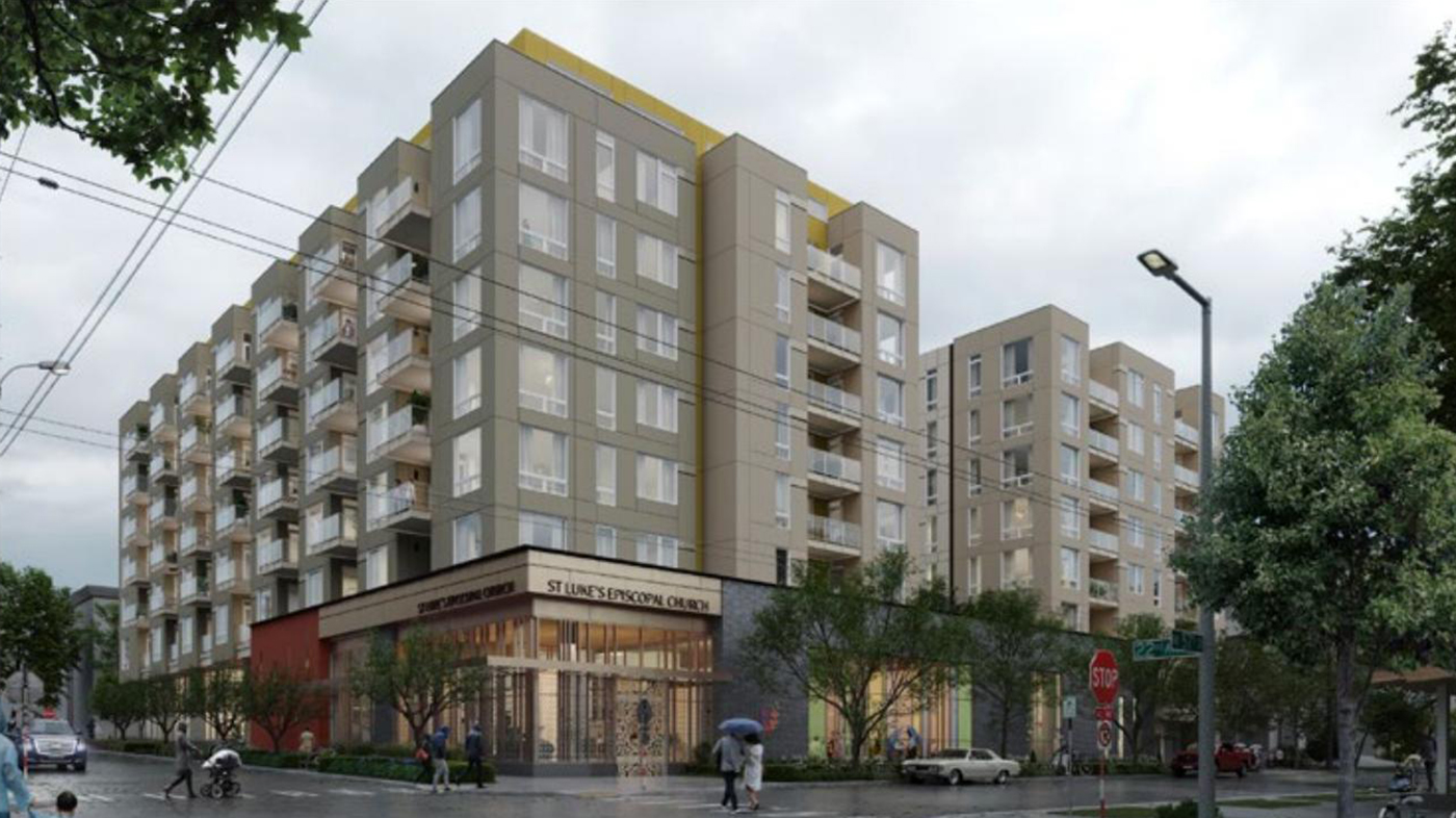 St. Luke’s Apartments provides studio, one-, two-, and three-bedroom homes that are affordable to households earning up to 60% of the area median income. Amenities include a community room, bike storage, resident services, shared laundry on each floor, and a rooftop deck and play area. Comprehensive resident services will be provided by FamilyWorks through a grant from UnitedHealth Group.